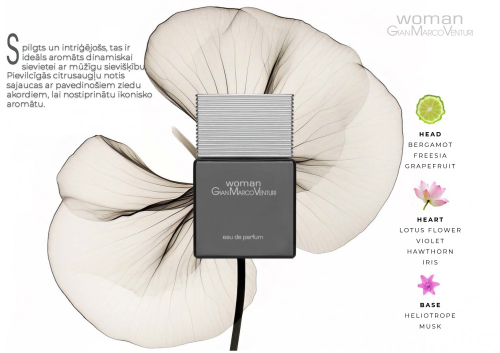 Neaizmirstama sieviete. Gian Marco Venturi aromāts sveic Jūs ar spožas gaismas stariem, kas ir pilni svaiguma , citrusa un frēzijas dvesmas. Tā sirds nots, intensīva un eleganta kā ziedlapiņu lietus, saplūst ar valdzinošo samtaino un maigo pamatnots izsmalcinātību, atstājot noturīgu, smalku un intriģējošu noskaņu.
